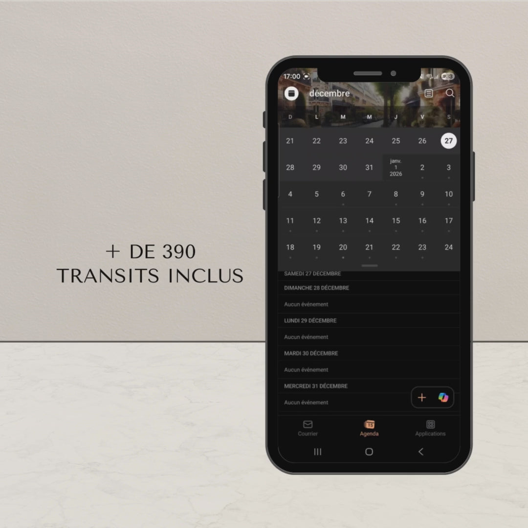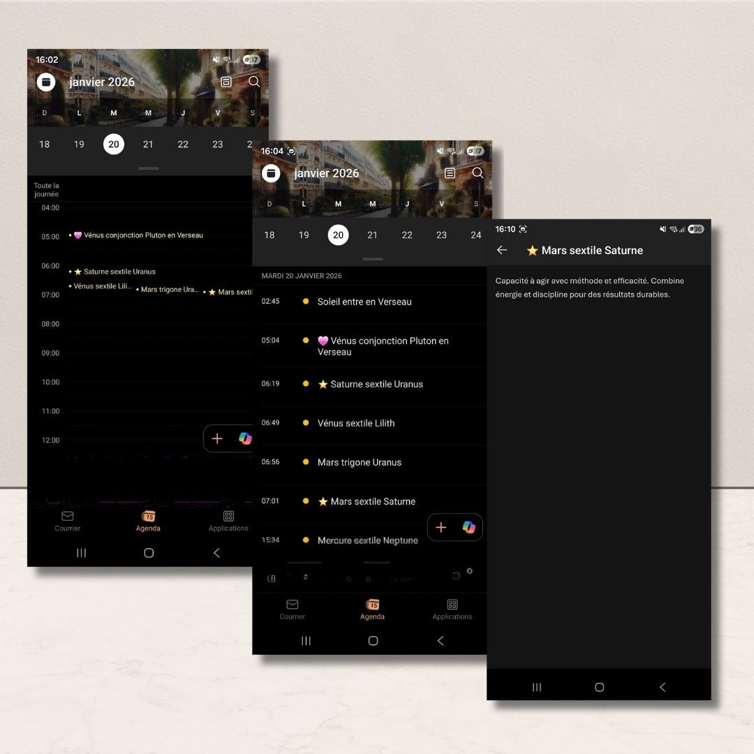 Une fois installé, tu as accès à tous les évènements astrologiques et leurs interprétations, pour l’année 2026, autant de fois que tu veux.