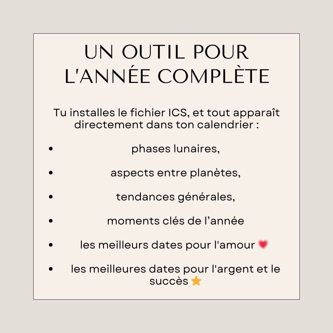 Ce que tu tiens entre les mains, c’est le Calendrier Astrologique 2026 en version digitale (.ICS), un outil simple à installer sur ton calendrier iCal, Google Outlook etc, pensé pour t’accompagner au fil de l’année et te donner une lecture simple et instantanée des énergies du moment.
